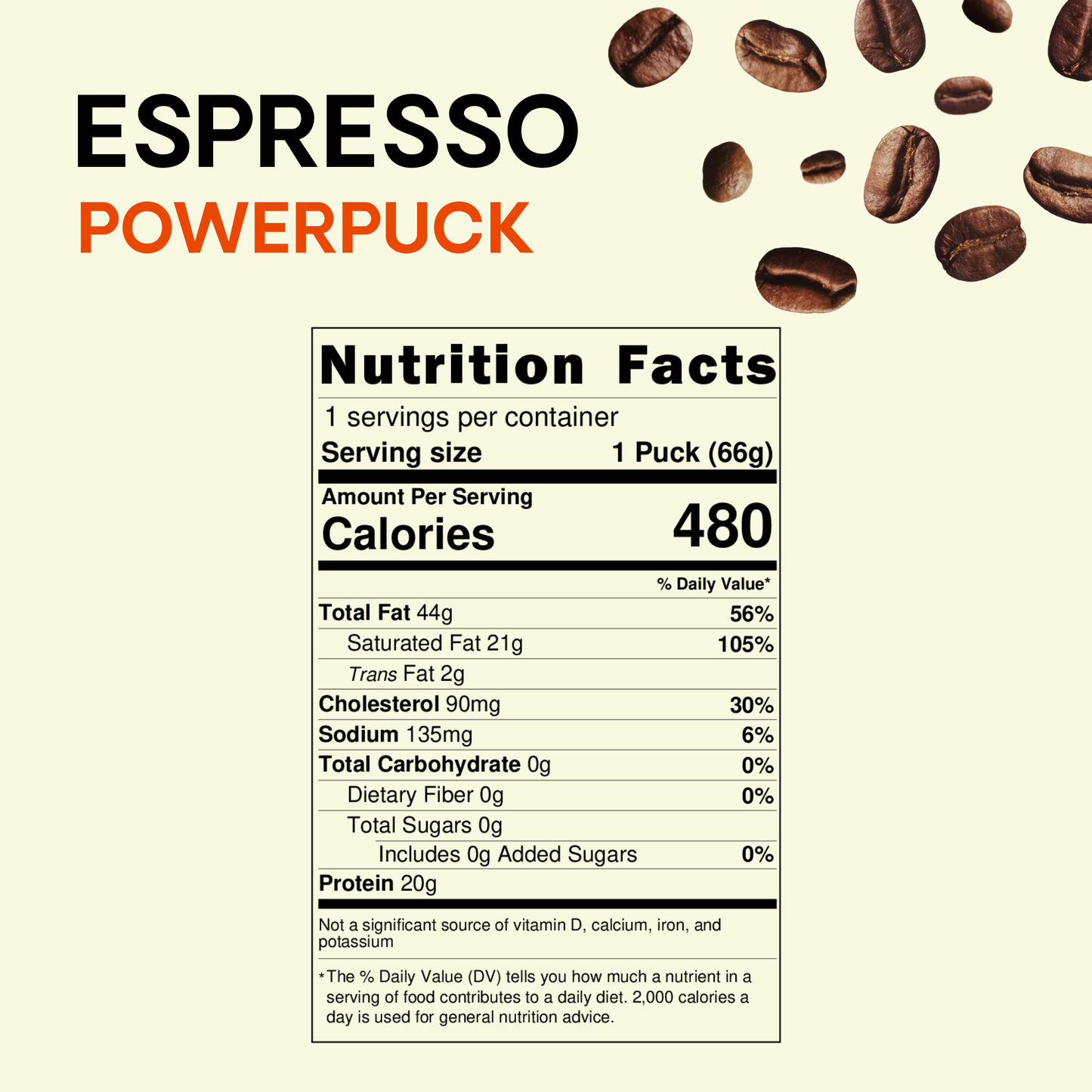 New & Improved Formula - Our new and improved formula contains 480 calories, 20 grams of protein and just five clean ingredients - grass-fed beef tallow, grass-fed whey protein, pork rinds, thaumatin and organic cocoa, organic vanilla bean or espresso powder for flavor. We removed everything that wasn't necessary to make the cleanest PowerPuck possible!